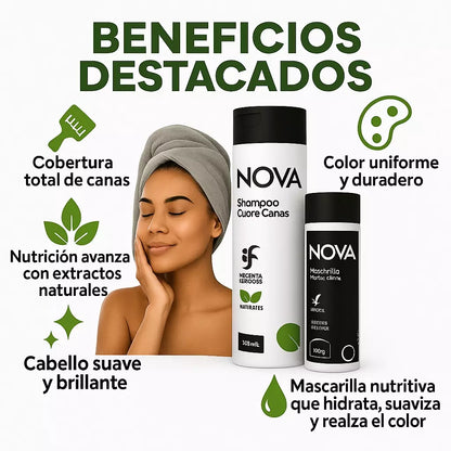 Nuestro Shampoo y mascarilla NOVA es fácil de aplicar y renuevan tu cabello y cubriendo las canas sin dañarlo.